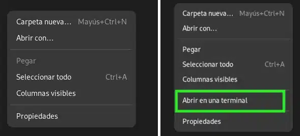 Una de ellas es la opción de abrir una terminal dentro de una carpeta específica. En otras distros, simplemente entras en la carpeta en modo gráfico, botón derecho y seleccionar «abrir en una terminal» y te abre una terminal dentro de la carpeta que quieres.
