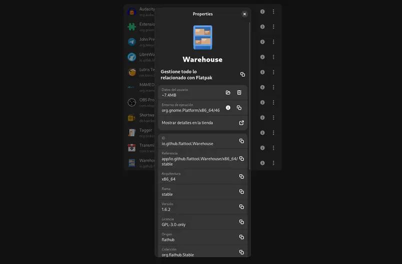 Sin embargo, gestionar los paquetes Flatpak es un poco más complicado, ya que su condición de sandbox, arroja muchos archivos. Para eso tenemos Warehouse.