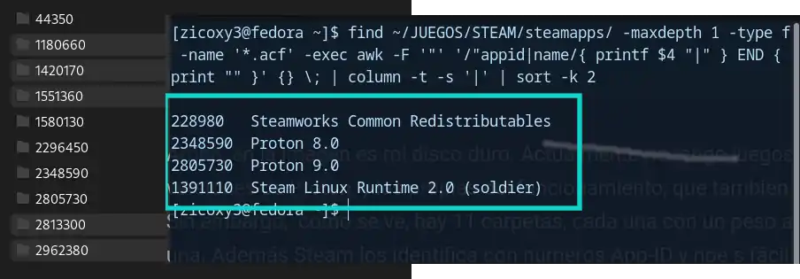 Sin embargo, como se ve a la izquierda, hay 11 carpetas, cada una con un peso alrededor de 250 mb cada una. Además Steam los identifica con números App-ID y no es fácil identificarlos para borrar esas carpetas de juegos que ya no usamos. Con ésta línea en la Terminal, podemos saberlo, como se ve a la derecha de la imágen.