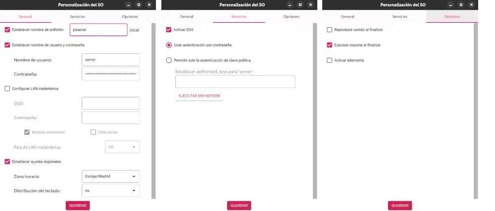 En un servidor, sería conveniente conetcar la Raspberry a internet por cable., pero si queréis conectarla por WIFI, también podéis configurarla en Configurar LAN inalámbrica. Una vez configurado todo, le damos a Guardar.
