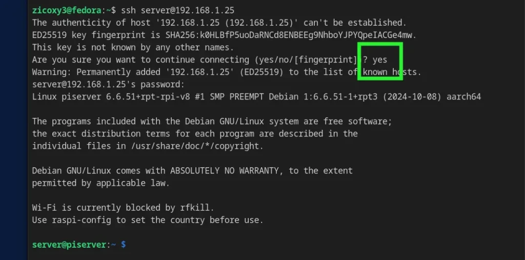 Osea, el usuario que hemos configurado en el programa Raspberry Pi Imager, una arroba y la IP que hemos descubierto con alguna de las opciones anteriores…. Nos pide nuestra contraseña y de repente, nos salen un montón de letras. Como véis en la imagen hay un cuadradito verde. La terminal te pide que confirmes la conexión…. Simplemente teclea yes e INTRO.