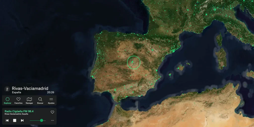 Con un estilo muy visual, como podéis observar, cada puntito verde es una emisora. Sí, es simplemente alucinante. Localizas un punto moviendo el ratón en el globo y automáticamente se reproduce.
