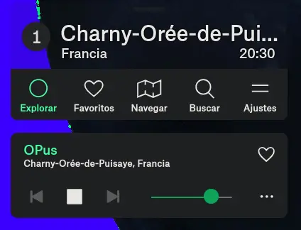 A la izquierda tenemos una menú simple, con las opciones justas. Explorar girando el mapa, guardar la emisora actual como favorita, navegar, buscar y unos ajustes esenciales.